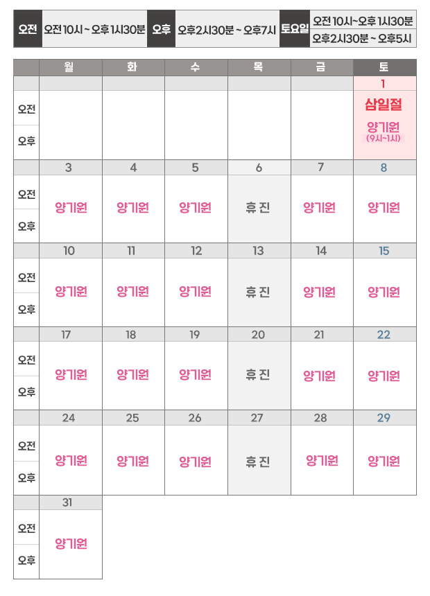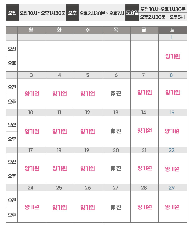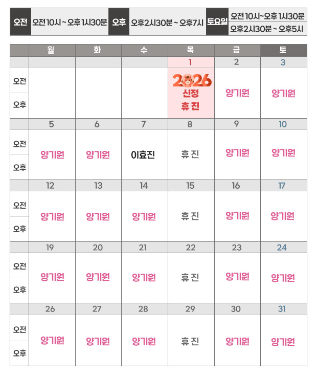 | 평일 | 오전10시 ~ 오후7시(목요일 휴진) |