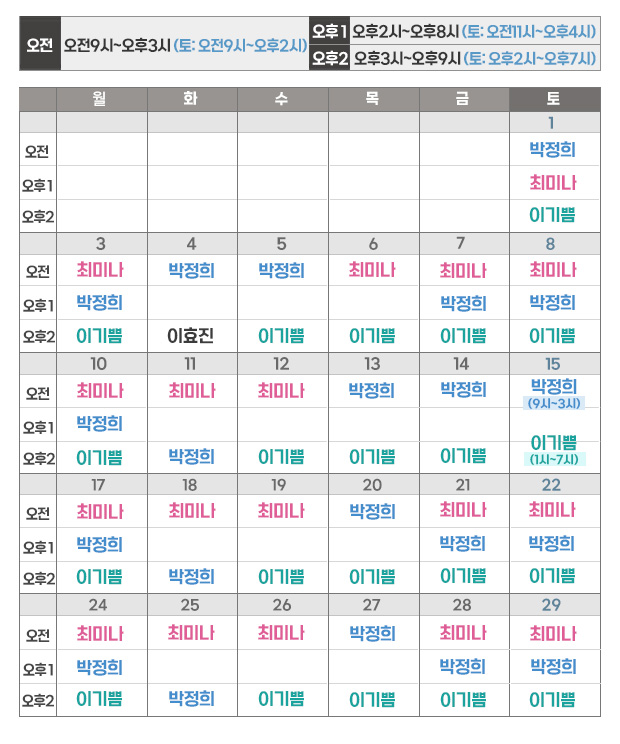 | 공휴일 | 오전9시 ~ 오후1시 |
